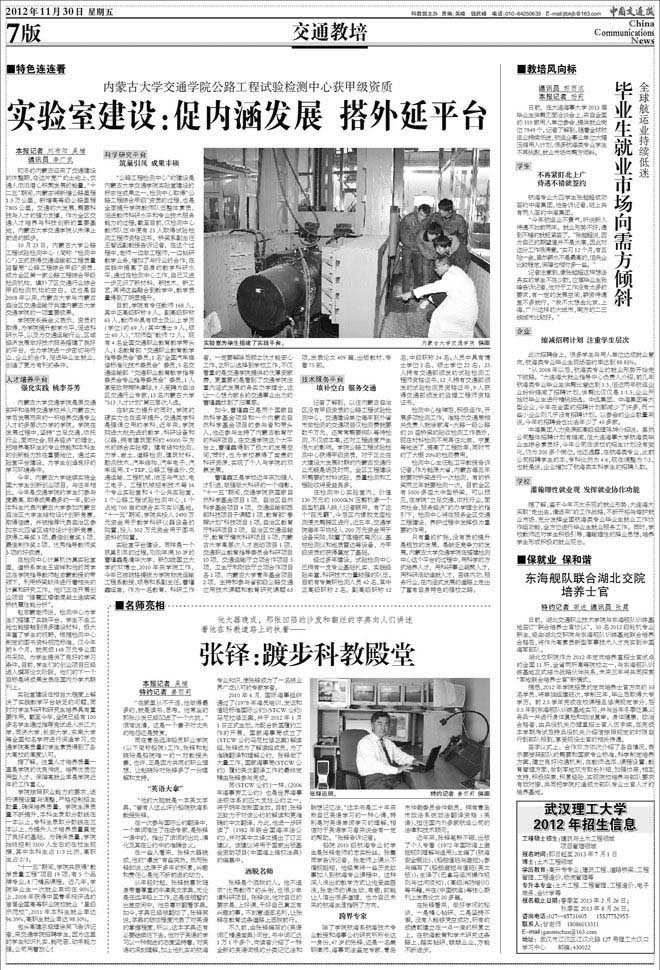 內(nèi)蒙古大學交通學院是原交通部呼和浩特交通學校并入內(nèi)蒙古大學后發(fā)展而來的一所培養(yǎng)交通專業(yè)人才的多層次辦學的學院。學院在發(fā)展過程中,堅持“立足交通、依托行業(yè)、面向社會、服務經(jīng)濟”的理念,把培養(yǎng)高職生的專業(yè)技能和本科生的創(chuàng)新能力放在重要地位,通過實驗室平臺建設(shè),為學生創(chuàng)造良好的學習環(huán)境條件。
