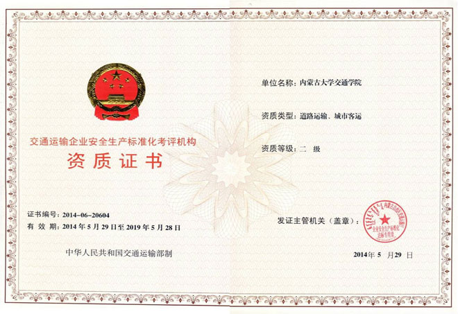 根據(jù)《內(nèi)蒙古自治區(qū)交通運輸廳關(guān)于公布第二批交通運輸企業(yè)安全生產(chǎn)標(biāo)準(zhǔn)化考評機構(gòu)的通知》,我院于2014年5月30日被認(rèn)定為自治區(qū)第二批交通運輸企業(yè)安全生產(chǎn)標(biāo)準(zhǔn)化二級考評機構(gòu),承擔(dān)自治區(qū)范圍內(nèi)道路運輸與城市客運類企業(yè)的安全生產(chǎn)標(biāo)準(zhǔn)化建設(shè)二級達(dá)標(biāo)考評工作,資質(zhì)證書的有效期五年。目前自治區(qū)交通運輸廳已批準(zhǔn)成立4家二級考評機構(gòu),負(fù)責(zé)對道路運輸、城市客運、交通運輸工程建設(shè)等5個專業(yè)類型的企業(yè)進(jìn)行安全生產(chǎn)標(biāo)準(zhǔn)化建設(shè)達(dá)標(biāo)考評。