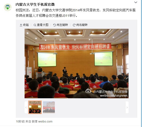 內(nèi)蒙古大學生手機報官微:交通學院成功舉辦2014年“東風雪鐵龍”、“東風標致”首屆定向班汽車服務網(wǎng)點