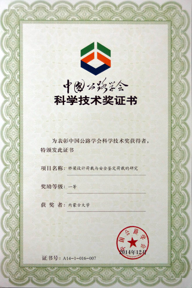 由我院教師王智遠、張春梅、李艷麗、張大偉參與研究的交通運輸部西部交通科技項目《橋梁設計荷載與安全鑒定荷載的研究》獲得了2014年度中國公路學會科學技術一等獎。該獎項每年評選一次,我院主要承擔的是該課題的子課題之一《典型運煤公路橋梁---包頭黃河公路大橋荷載特征研究》。