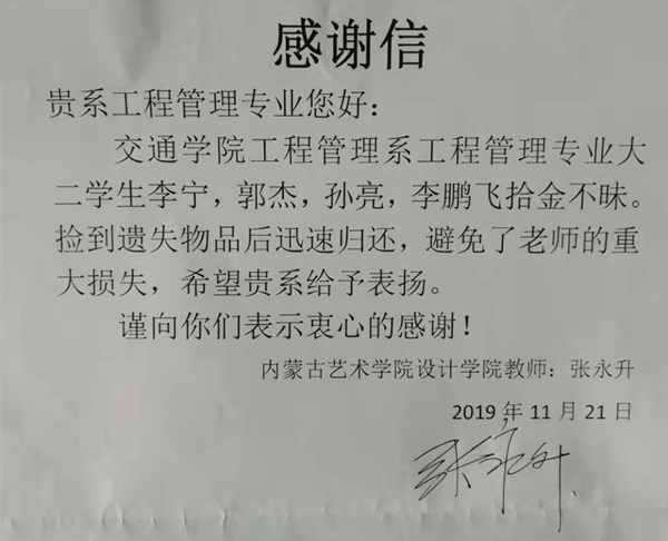 11月21日上午,工程管理系黨總支收到了藝術(shù)學院張永升老師送來的感謝信,感謝高管31班李明、霍杰、孫亮、李鵬飛四位拾金不昧、熱心助人的好青年。