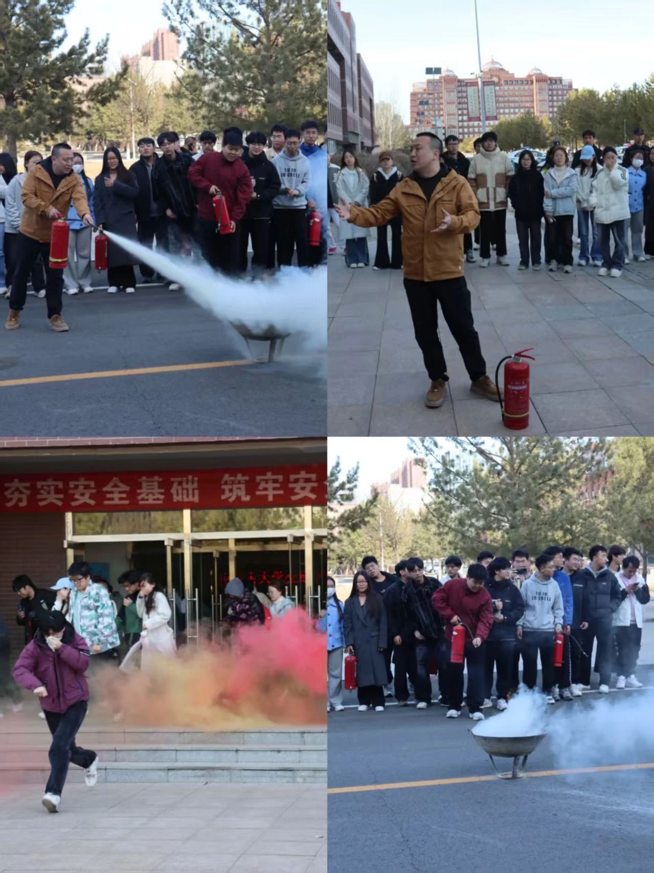 逃生演練在交通樓J區(qū)有條不紊地進(jìn)行,工作人員點(diǎn)燃煙幕彈,拉響警報的同時學(xué)生們按照預(yù)定路線迅速撤離,整個過程秩序井然。隨后內(nèi)蒙古建筑職業(yè)技術(shù)學(xué)院消防技能訓(xùn)練中心(基地)負(fù)責(zé)人方嘉淇對各種類型的滅火器進(jìn)行了介紹,詳細(xì)講解了滅火器的使用方法,并指導(dǎo)學(xué)生實(shí)際操作體驗(yàn)。同學(xué)們在保衛(wèi)人員的指導(dǎo)下分組上陣進(jìn)行實(shí)操演練,掌握滅火器的正確使用方法,明晰火災(zāi)發(fā)生時應(yīng)該采取的有效行動。